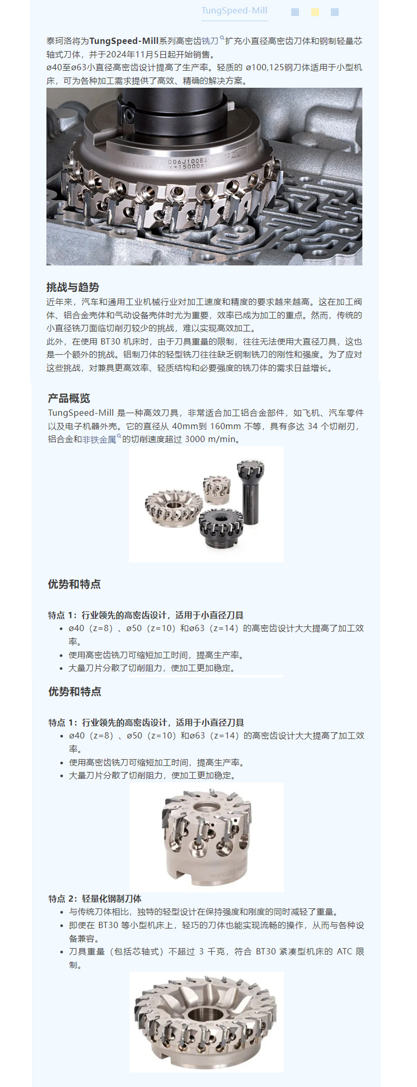 【泰珂洛】TungSpeed-Mill擴(kuò)充小直徑高密齒刀體和適用于小型機(jī)床的輕量化芯軸式刀體